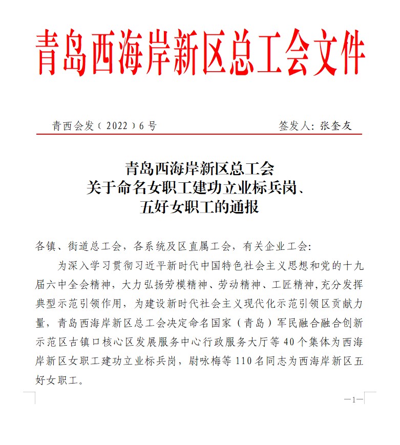近日,青島西海岸新區女職工建功立業標兵崗名單出爐,包含40個集體,??丶瘓F法務和風控管理崗獲評該榮譽。